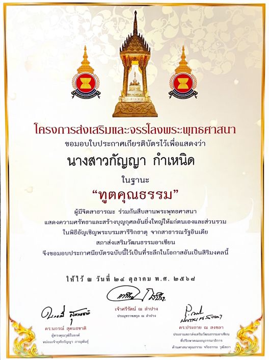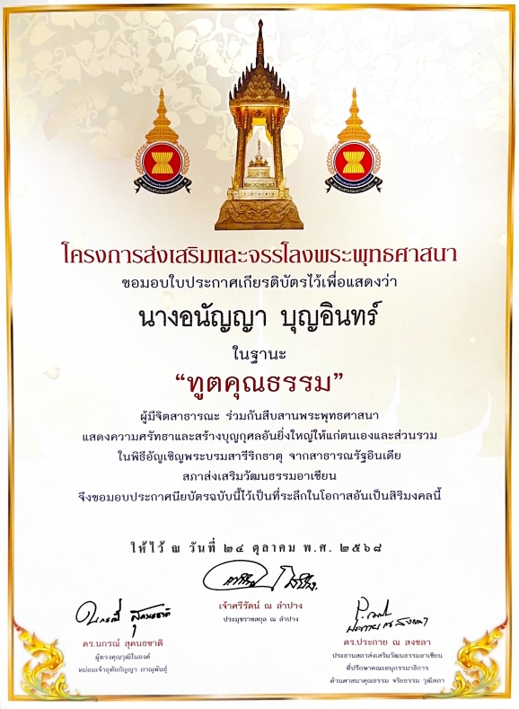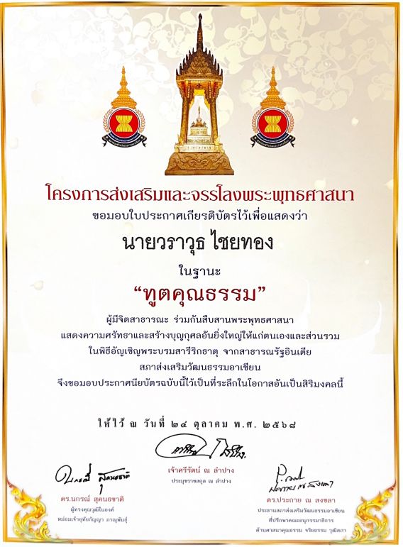 โครงการส่งเสริมและจรรโลงพระพุทธศาสนา “ทูตคุณธรรม” ผู้มีจิตสาธารณะ ร่วมกันสืบสานพระพุทธศาสนา แสดงความศรัทธาและสร้างบุญกุศลอันยิ่งใหญ่ให้แก่ตนเองและส่วนรวม ในพิธีอัญเชิญพระบรมสารีริกธาตุ จากสาธารณรัฐอินเดีย |